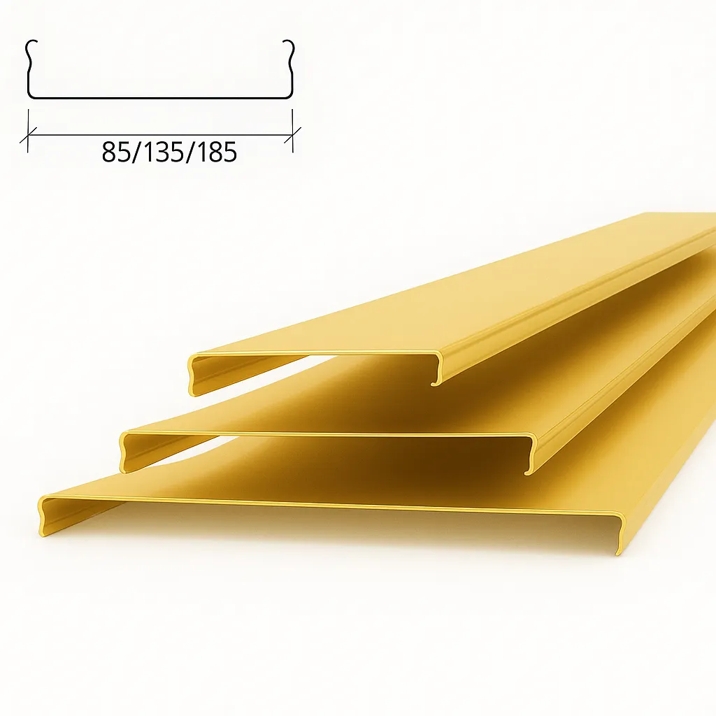 AN85A золото — дизайнерская алюминиевая потолочная рейка с открытым типом монтажа и шагом установки 100 мм. Премиальное золотое покрытие подчёркивает статус и визуальную выразительность пространства. Идеально для интерьерных зон с повышенными декоративными требованиями: ресепшены, бутики, бизнес-залы, салоны и кафе.