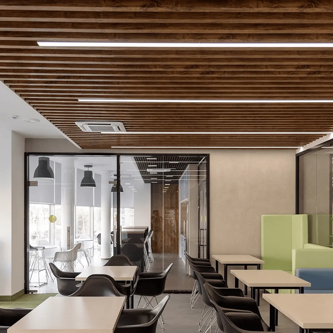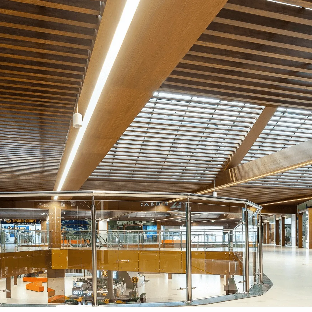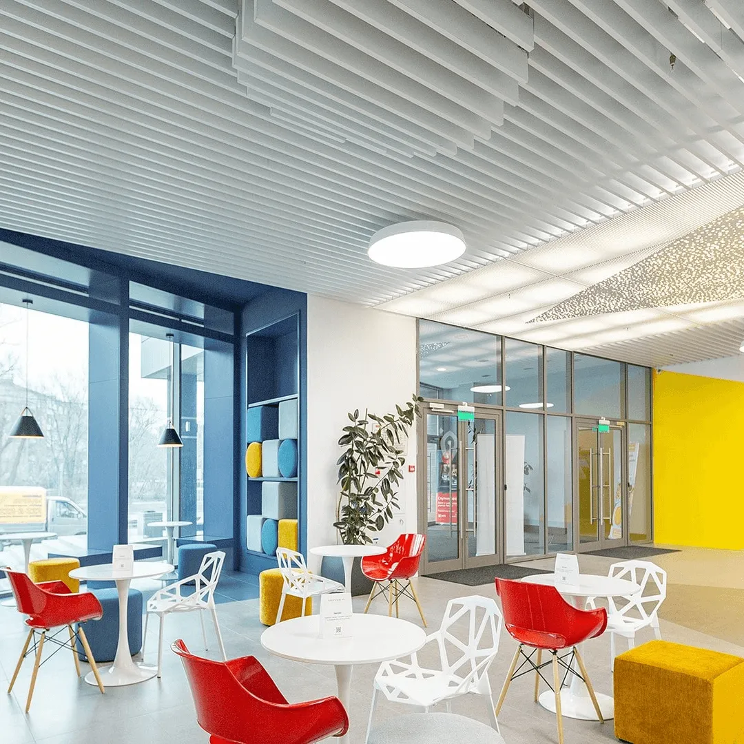 - Реечные потолочные и стеновые системы: металлические ламели, доступные в различных цветах по шкале RAL, а также с текстурами ценных пород дерева. Возможен монтаж в разных плоскостях и с различным шагом, включая установку "волной".